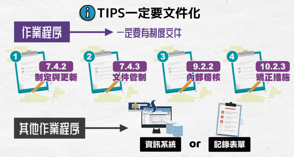 在TIPS規範中,需要文件化的作業程序,只有4大項目而已,其他作業程序可以透過資訊系統或紀錄表單等來確保,可依循一致的規範來落實就可以了。不過,相關的做法,建議可以諮詢貴公司的輔導顧問,顧問會就貴公司的實際狀況提供最好的建議跟做法。