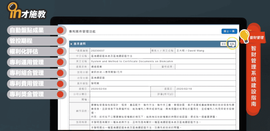 那就真的會變成紀錄文件的系統而已,不是我們企業真的需要的「專利管理系統」這些部分都請各位企業朋友可以多加參考利用。