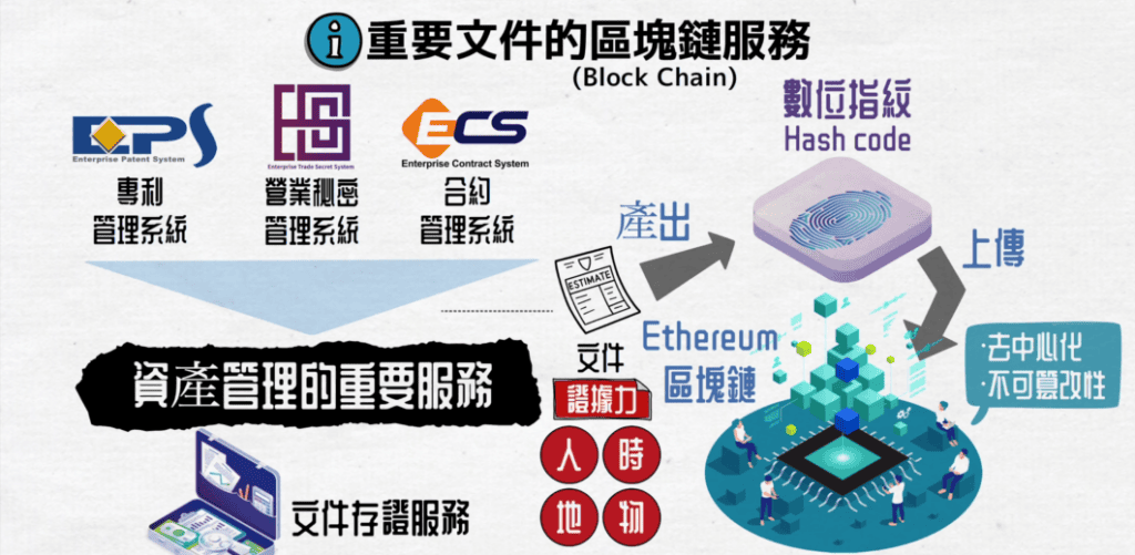 新穎公司的「專利」、「營業秘密」以及「法務的合約」管理系統,都有提供將公司的相關提案文件進行區塊鏈,做為證據力保存依據。也就是文件的「存證服務」,就是將文件產出世界上獨一無二的數位指紋,或者稱「Hash value」,把這個「Hash value」,上傳在區塊鏈中,藉由區塊鏈去中心化、不可被竄改的特性,做為文件的證據力,證明保存的人、時、地、物。