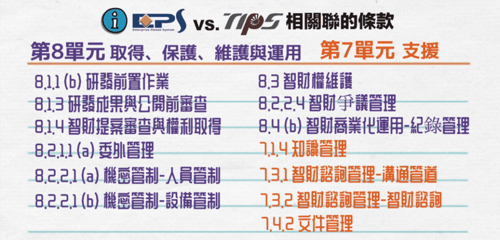 透過「EPS專利管理系統」就可以滿足部份TIPS規範,我們自己彙整可以與TIPS條文配合的大概有10項條文規範,主要以第八單元專利的「取得、保護、維護、運用」為主。包括有: