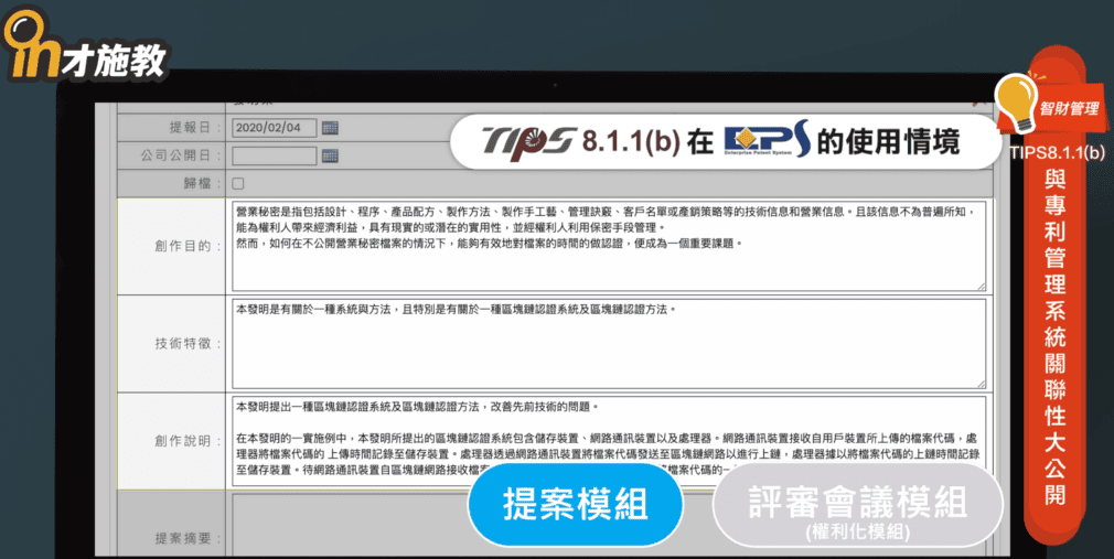 - TIPS8.1.4的「智財提案審查與權利取得」