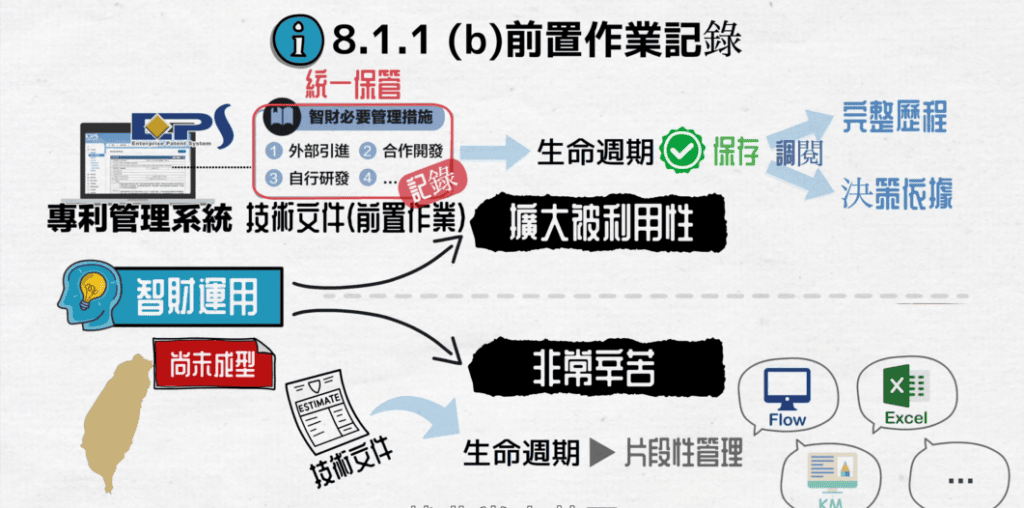 當公司習慣將不同階段的專利管理流程,使用多種方式來進行個別管理,很容易造成資訊不一致。以TIPS 8.1.1(b)專利取得的前置作業為例,我們將分享相關資訊系統設計重點以及管理運用經驗,並詳細的跟你剖析系統設計重點。