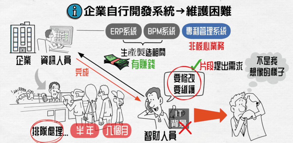 通常企業的資訊人員最主要會以ERP、BPM系統與生產製造有關的系統Maintain為主,專利管理系統不是核心業務,所以要修改要維護服務,都要排隊處理。可是「智財」人員不是IT背景,只能片斷提出需求,等到IT做完後,發現不是想像中的樣子,就要再改系統。