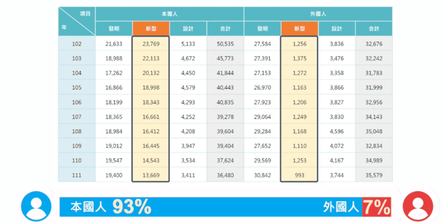 台灣的新型專利有高達90%以上都是由本國人所申請,而外國人申請新型專利的比例大概只有7-8%。