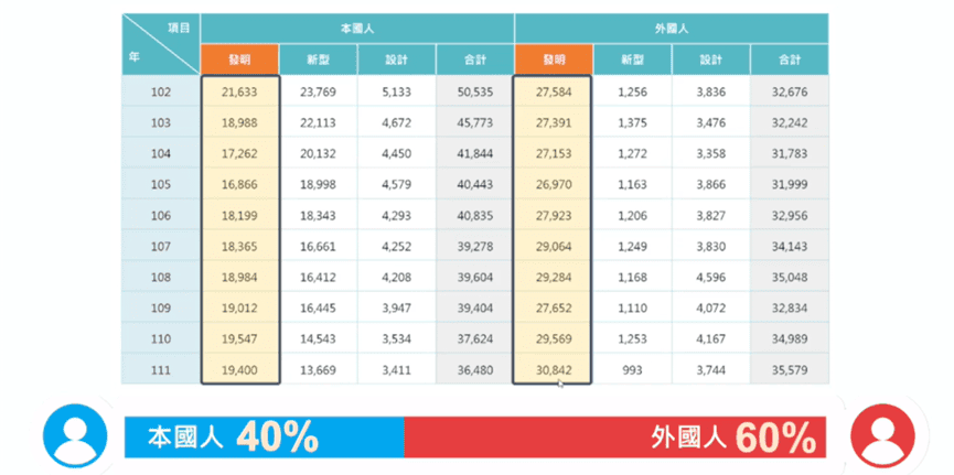 台灣本國人發明專利的申請比例大概在39-40%,外國人往年申請發明專利的比例都維持在59-60%左右。