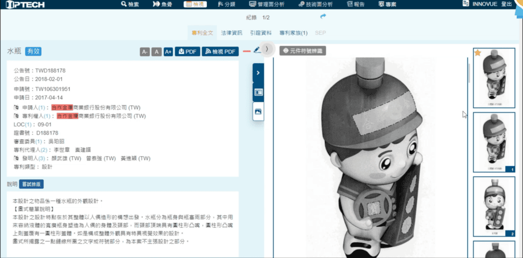 如果這個設計跟企業的營運目標相關,例如:合庫的創新金融商品與服務跟這個水杯寶寶有關,或許申請商標比較好,因為要大肆宣傳嘛!申請設計專利,主要是保護物品的外觀,透過合庫寶寶造型的水杯,通常是如果經費很多話,再思考就可以了。