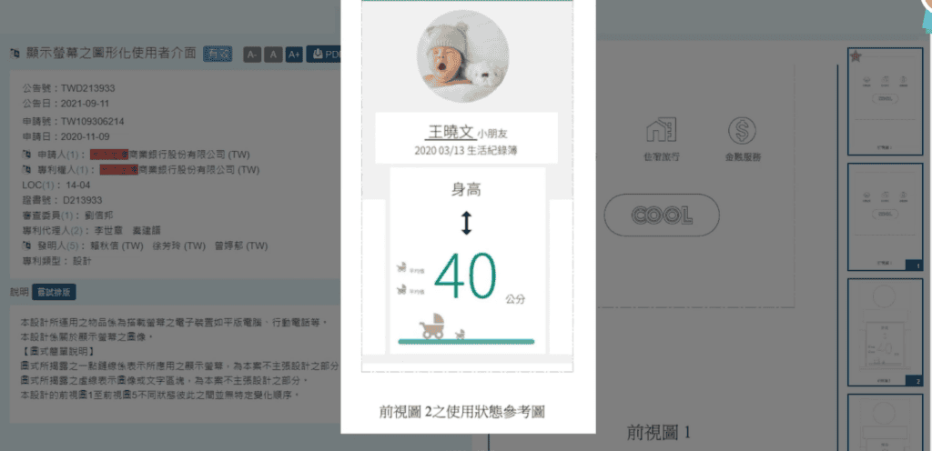 我們可以從這裡,就可以點選下一筆專利,一樣這裡會列出全部的圖式,這樣看如果太小,直接案這裡的擴大符號,就可以打開放大。這是一筆電子裝置的螢幕圖形化使用者介面專利。所以這裡設計的非常清楚,這個使用界面就有』托嬰服務、住宿旅行、金融服務」,接下來會開始展開這個托嬰服務的界面設計,後面幾張還附帶了使用狀態的參考圖,IPTECH把設計專利呈現的非常的清楚。