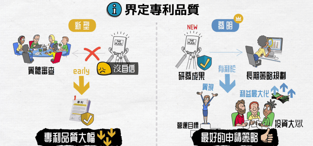 一直以來,有朋友會問我,如何界定專利品質,我都很想跟朋友們說:如果企業申請新型專利的目的,是因為新型不需要經過實體審查,其實也代表企業對自己的專利也沒有自信能通過。所以想透過申請新型專利,至少保留一種專利權利,雖然也可以盡早取得專利保護,但是申請新型專利,專利品質也會大打折扣哦!