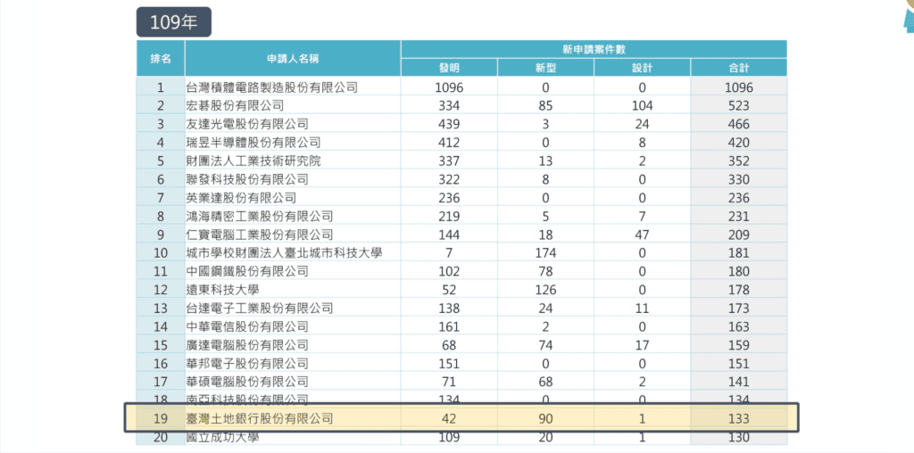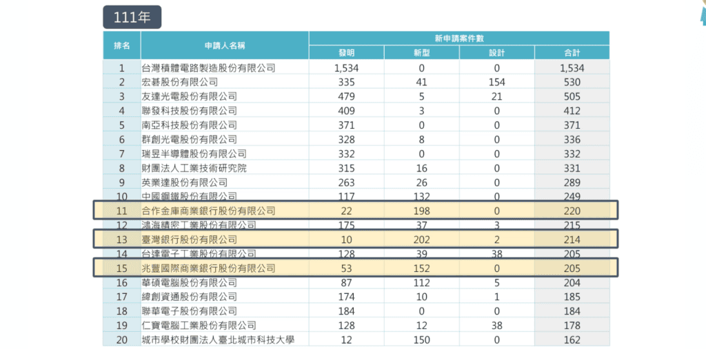 我們可以從這幾年歷年專利新申請案件數前20的排名發現,從109年開始,銀行業的專利申請開始輩出,109年-土地銀行;110年-中國信託、合作金庫;111年-合作金庫持續大量申請,以及台灣銀行跟兆豐金也出現在排名內,新型專利申請量相當大。但銀行怎麼會採用新型當專利的主要申請策略呢?這完全不合理吧!