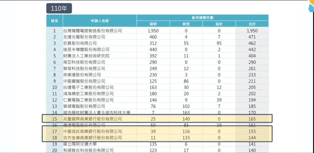 今天我們從智慧局公布的「專利年報統計」資料,討論一下國內銀行業的專利申請概況,大家如果有興趣,台灣銀行、其他您投資或是有興趣的銀行,他們的創新研發技術在哪裡,您都可以嘗試檢索看看。