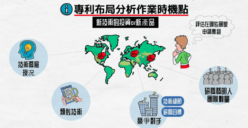 同時,因為專利是屬地主義,所以在技術投入研發之際,也可以評估要到哪些國家申請專利以保護這些技術,這些都是專利布局分析情報的使用時機。是針對新技術進行投資之際,企業應該要針對創新技術來進行專利布局分析。