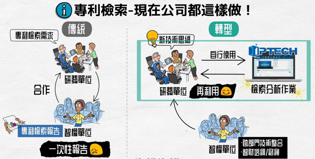所以,現在有許多企業已經將專利檢索落實到研發團隊實做,智權同仁會扮演策略性的跨部門技術整合、智財培訓或是諮詢的角色。