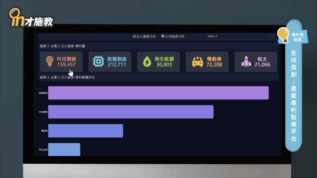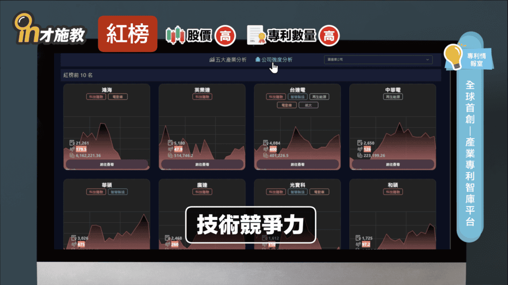 全球首創「產業專利智庫平台」-全面解析科技體驗、智慧製造、再生能源、電動車、航太等關鍵產業的專利技術情資!互動式分析,深入掌握各大企業的專利佈局、營收規模、股價走勢,一手掌握科技產業的競爭優勢!