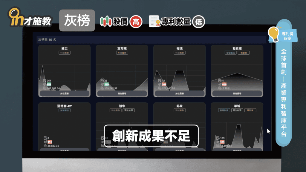 灰榜是:股價不錯,但是專利成績有限。屬於市場給予很大的投資,但是公司的創新成果不足,可能存在估價過高。