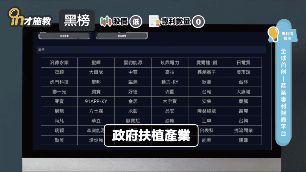 黑榜是:上市櫃公司,但是零專利。屬於政府扶植產業的廠商,但卻沒有專利產出。