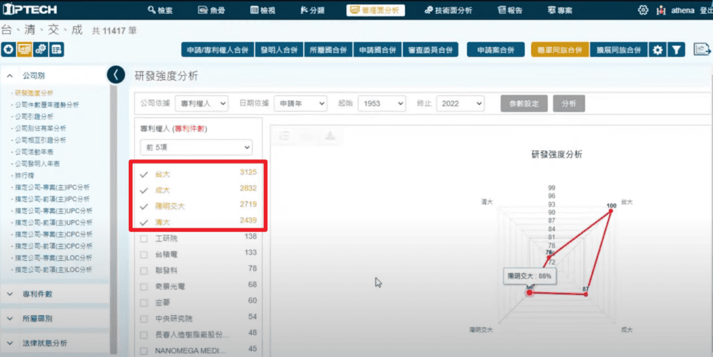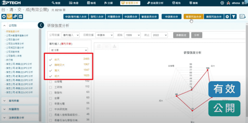 我們一樣從研發強度分析這個功能開始來解讀,從這裡可以看到台大,它的專案件數(有效+公開)有2,485案,清大的數量是1,947案,陽明交通大學有1,947案,成大是1,625案。