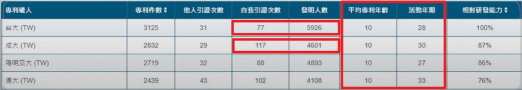成大的特色是它的自我引證次數是最高的。發明人的集中度,也就是專利產出的發明人,是否集中在特定人員身上,目前看起來也是稍微集中一點的。