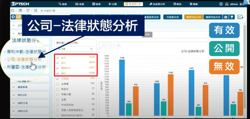 可以從這裡來看出,在各校台、清、交、成的法律狀態,直接勾選,台、成大、陽明交大跟清大,按下「分析」功能,我們在下方這個畫面,就可以看到各校的「有效」、「公開」跟「無效」的專利件數統計了。