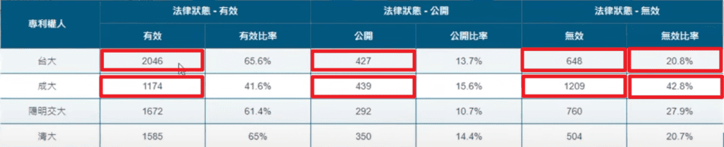 但當把法律狀態這個議題納入討論,成大的無效專利高達40%多,所以如果只探討專利的有效性,成大的有效專利數量確實相對更少的。