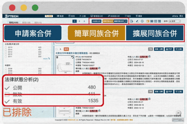 而我們這裡的分析是「簡單同族合併」為依據,分析標的已經排除了無效專利,所以我們鎖定法律狀態只有「有效」跟「公開」。因此分析標的不同,當然數量也會不一樣。