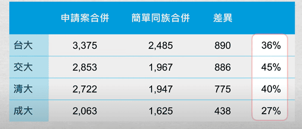大家如果有興趣,可以再將專利申請案合併與簡單同族合併的表製作出來,加值一下做一點比例統計,您可以看到台大約有36%的專利,會做兩個國家以上的專利布局,交大約45%,清大約40%,成大只有27%。