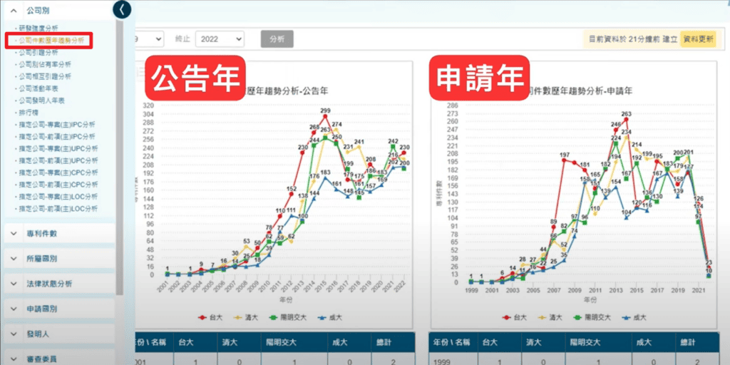 我們就可以透過「公司別」中的「公司件數歷年趨勢分析」功能,可以分析針對「公告年」跟「申請年」來分析。