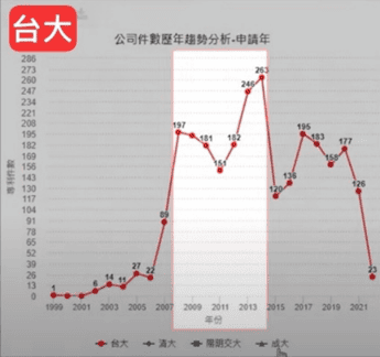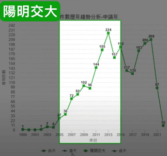 陽明交通大學,則是大概從2005年到2015年,這十一年的專利產出,它穩定高峰,雖然沒有台大的高峰明顯,可是它的專利是持續不斷的在產出的,尤其是在2020年這個時間,交大跟陽明大學通過合併案,所以專利的申請件數也有很明顯的提升。