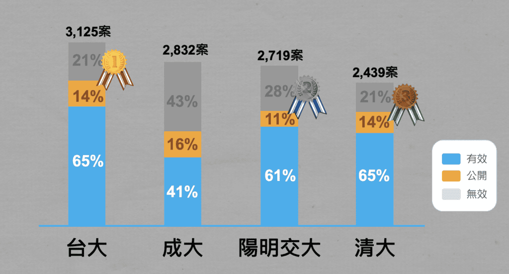 台大目前的有效的件數是2046案,公開專利(尚未核可獲證的專利)總共有427案,無效專利(專利已經逾期失效)也有648案,無效專利比例約兩成左右。
