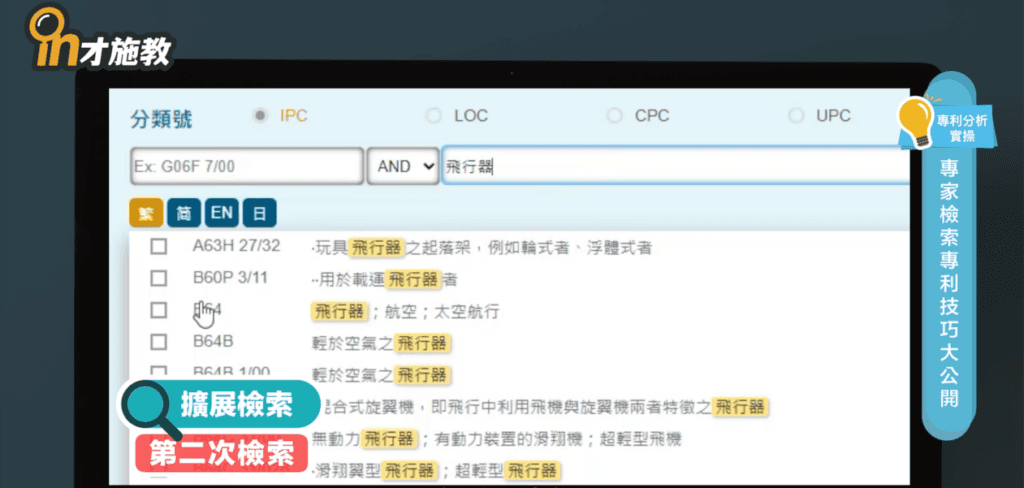 因為一剛開始,會需要聚焦在完全相符的技術標的,會先以精準檢索的方式,查詢符合關鍵字的專利清單,但是透過精準檢索,專利數量通常不夠,因為有些專利用語跟我們常用的技術用語不同,例如:無人機,有的時候會被寫成無人飛行載具、UAV或UAS等等。