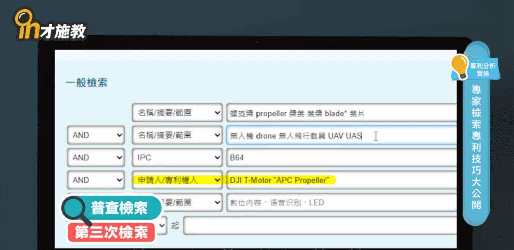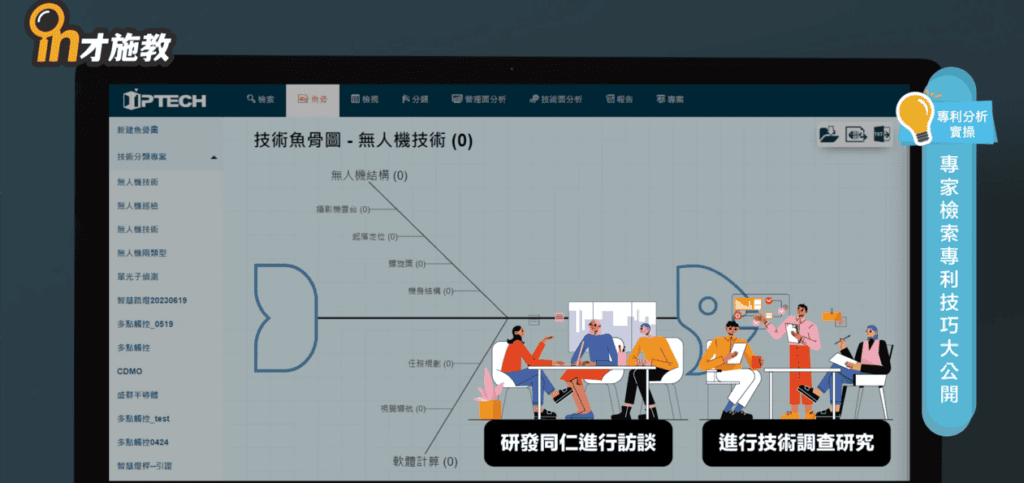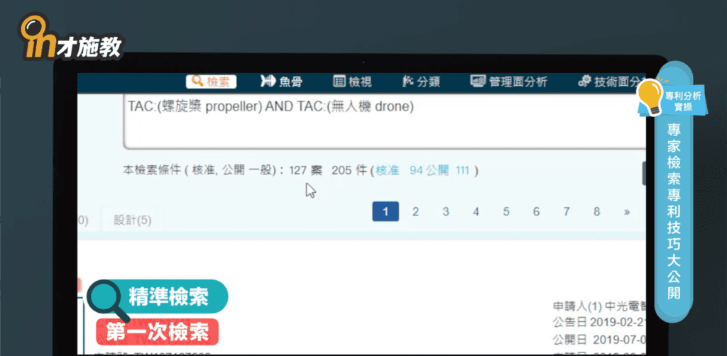 透過訪談跟討論,我們就能清楚掌握技術的魚骨架構,以及技術的特徵,以順便發展各魚支節點的檢索條件,先進行初步的檢索,掌握符合的專利標的出來,例如:無人機的螺旋槳專利,螺旋槳的名詞,可能還有同義字,例如:螺旋槳