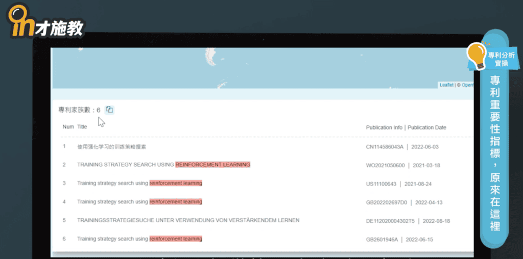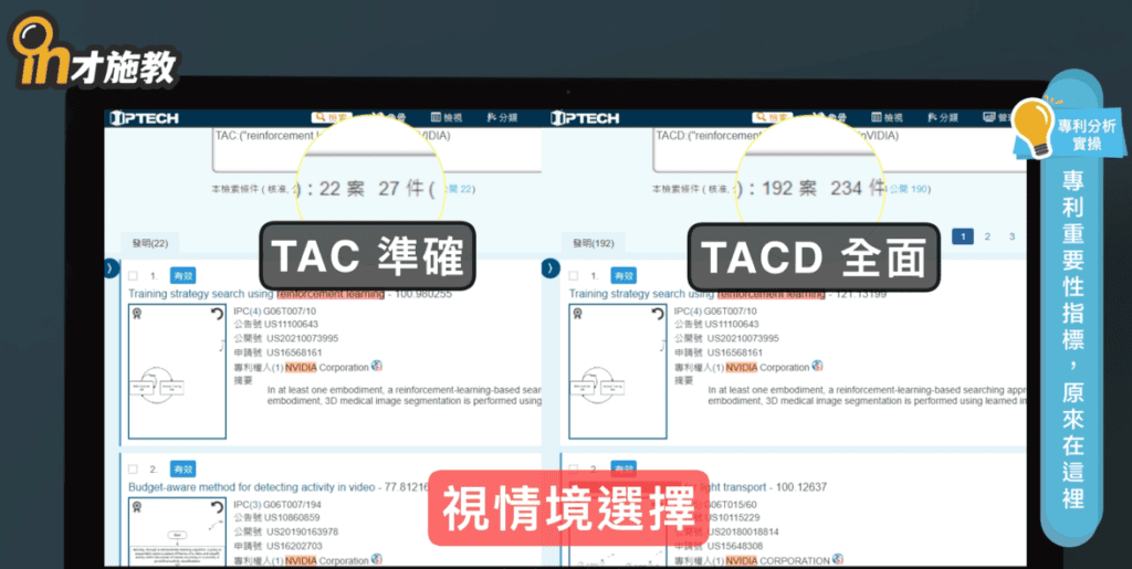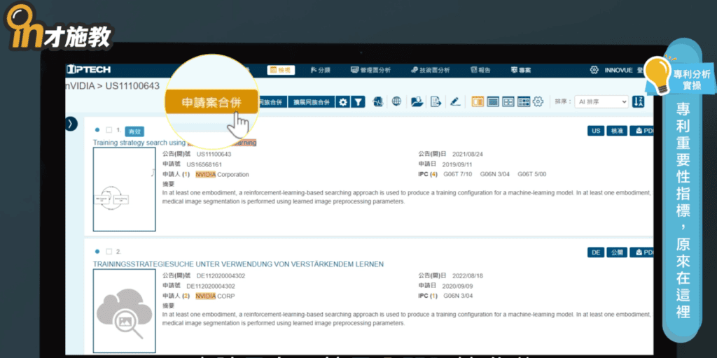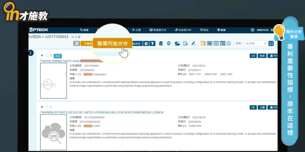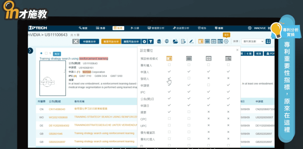 我先將nVIDIA下在「申請人/專利權人」這個欄位,再加上TAC輸入「reinforcement learning」,直接檢索。這大概都是有關於nVIDIA在「強化學習」地部分,當然要更精確判斷,就請您直接就自己研究的定義,進行篩選。