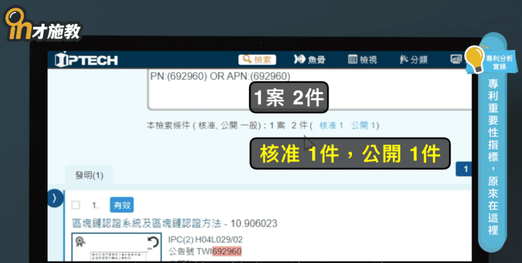 您也不用記甚麼TW、I、M、D等等,只要將692960輸入在這裡「號碼檢索」,選擇台灣,IPTECH就會直接查出跟692960號碼的專利,就是這一筆。「區塊鏈認證系統及區塊鏈認證方法」專利權人是我們公司-新穎數位文創股份有限公司。
