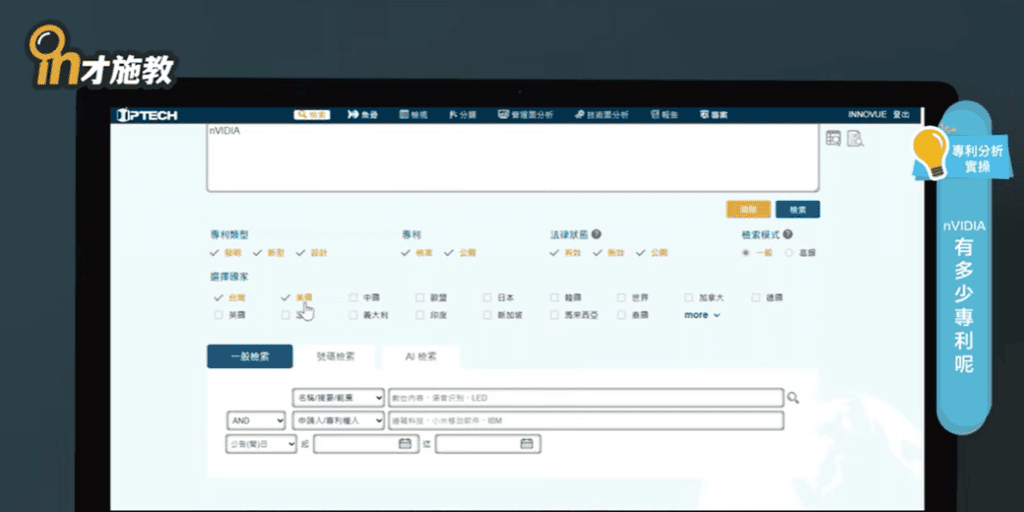 示範給大家看,在我們IPTECH系統裡,如果您也想直接進行全文檢索,那可以在這裡,直接輸入「nVIDIA」關鍵字,其他我們也不做設定,就是「台灣」、「美國」。我