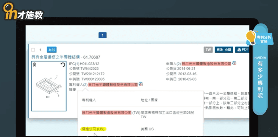 這裡無論是「申請人」或是「專利權人」這裡都有「2」,表示有2個申請人或是「專利權人」,我們點一下看看,所以這案是不是有日月光跟美商輝達。