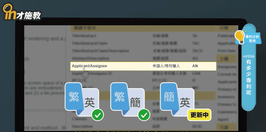 我們現在已經將申請人/專利權人查詢名稱從「繁體中文」連結到「英文」互轉;但是還沒有進行到「簡體中文」連結到「英文」互轉。這功能我們在近期就會更新,敬請期待。