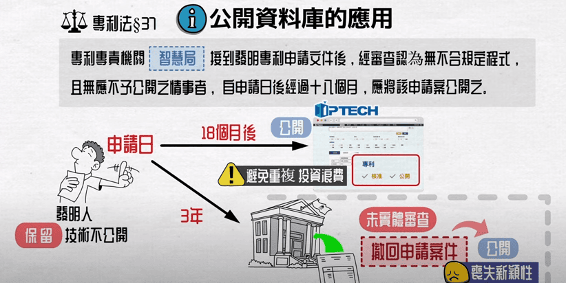 在專利法§37 專利專責機關也就是智慧局,接到發明專利申請文件後,經審查認為無不合規定程式,且無應不予公開之情事者,自申請日後經過十八個月,應將該申請案公開之。所以專利申請完的18個月後,智慧局就會將這筆專利進行公開,揭櫫在公開專利資料中。這是為了讓發明者可以先保留不公開技術18個月,但同時為了讓市場也知道已經發明了這個創新技術,避免重複投資的浪費,18個月就會強制公開申請專利。