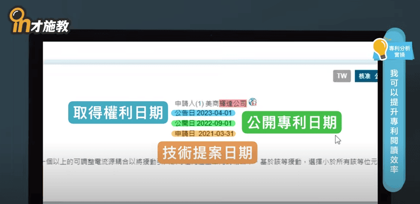 所以專利申請日的判斷非常重要,它是技術的提案日期;專利公開日一般就是官方公開該專利的日期;另外,專利公告日就是取得權利的日期。如果有公告日,就代表示獲准的專利,在核准資料庫是找得到的。但是,如果是沒有公告日的專利,就可能是正處於公開階段,或是已經3年的撤回案件;也可能是審查不通過的專利,都會在公開專利資料庫中。