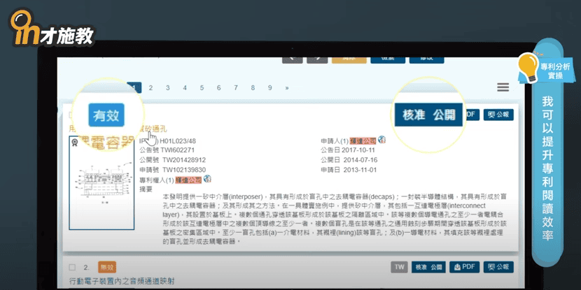 這裡的法律狀態訊息,是跟智慧局發布的雜項資料有關法律狀態的欄位進行整併的。核准專利,就是具有公告號的專利,而且狀態是屬於具有權利的專利。跟智慧局的雜項資料欄位同步,確認每一篇專利的權利現況。失效專利,這其中就包括有:撤回專利、失效專利、無繳費專利、或是審查不通過專利等等情境,系統都會進行法律狀態的整理。如果是核准+公開的1案專利,呈現模式會將它併為1案呈現,避免讓使用者重複閱讀。這就是之前一直在提的,專利要進行剔重的概念,提升專利閱讀的效率。