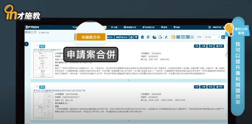 如果使用IPTECH就可以不用那麼麻煩的再判斷,直接將兩個資料庫合併勾選。一般也會默認就設定公開+核准專利資料庫合併檢索。在這裡,會將公開案隱藏,只顯示核准案。但如果專利尚未核准,就會顯示公開案;也有一種情境,是一公開案已經超過3年為無效,這裡都會呈現法律現況。