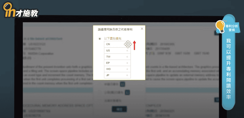 希望以「CN」優先呈現,那直接將「CN」拉上來,接下來移「US」「TW」,完成後「確定」。系統會問是否要重新整理頁面,請按「確定」。顯示代表專利就會以「CN」「US」「TW」為依序呈現的邏輯。