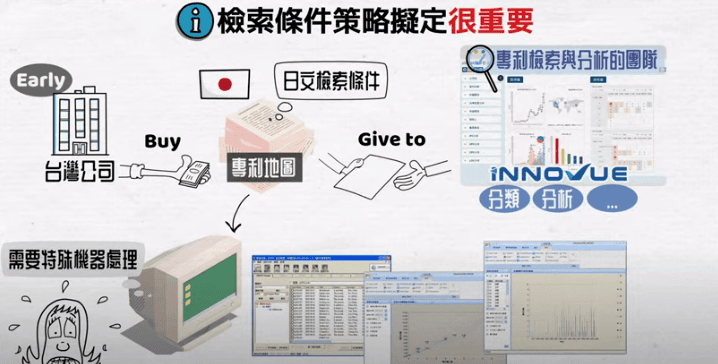 早期台灣有許多公司是會跟日本公司買檢索條件,接下來就會交給我們公司開始進行分類、分析等等的處理,專利分析早期叫做專利地圖。專利地圖其實是日本的叫法,以前拿到日本顧問公司的檢索條件以後,就要針對他們產出的條件逐一調整進入系統。以前的系統引擎光是要跑出他們的列表,就要特別機器處理,否則搜尋引擎根本跑不動。日本在專利的檢索技巧上,確實非常的札實,也很有能量。新穎公司也是這樣學習日本的檢索技巧,所以專利檢索跟分析的能量,才會一直在業界都有不錯的聲譽