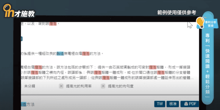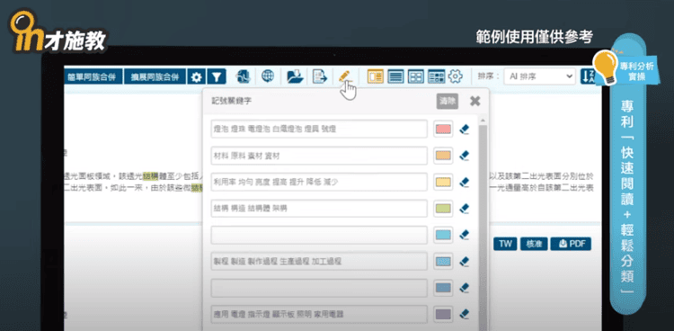 今天,我們的技術人員分享「專利閱讀與分類的技巧」。其實,提升專利閱讀效率,或是分類的技巧重點,都跟這幾集探討的關鍵字詞有非常大的關係。只要關鍵字詞可以累積完成,再加上標記關鍵字的使用等等技巧,專利閱讀或是分類都是非常簡單工作。