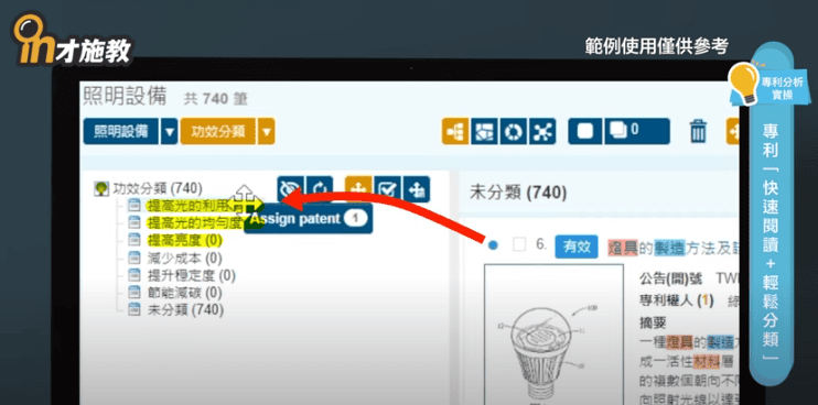 也有其他作法,例如多點幾筆,全部都拖到各項節點,接下來就用「刪除法」。比如說:「提高光的利用率」、「提高光均勻度」與「提高亮度」是非常重要的功效節點,那這頁20筆專利,先勾選,再全部拉過去「提高光的利用率」、「提高光均勻度」與「提高亮度」。接下來,如果發現,這筆跟「提高亮度」無關,就直接「X」,這樣比較快
