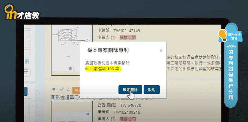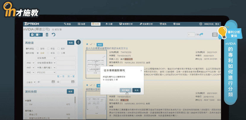 當專案儲存完成後,就直接到「專案」這裡,就可以看到nVIDIA的專案673案,還有最近修改日期。點選進來,就可以看到這673案的專利資料,並進行資料整理。使用者可以檢視後將不符的分析標的進行刪除,不要作為分析標的;或是將適合的標的打勾留下,再儲存成為另一個專案或另案分析等等。