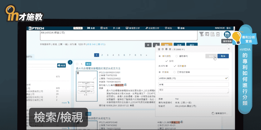 接下來就直接檢索673案,我也不進行任何檢視或修正了,我就直接儲存成為專案,透過專案來調整資料是最方便的。IPTECH是有就重要公司進行名稱統一的,相關訊息在第十六集即有特別說明,若如果有興趣可以參考。