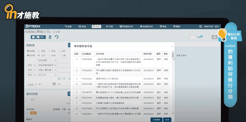 請按這個齒輪,先清除剛剛的檢索條件。接下來,勾選這裡,法律狀態「無效」總共有103案。勾選以後,按「檢索」。右邊還是會將這103案列出,再進行一次確認。如果沒有問題,請選擇這裡的「全選」或「本頁全選」。這裡的全選是指103案的意思,本頁全選是指這一頁的意思,總共20筆。直接按「垃圾桶」刪除,就可以了,這裡也會呈現您現在的刪除筆數。當然如果確定這些刪除的資料都不需要了,請點選畫面這個圖示,跳出的視窗是專利刪除暫存區,點選全部刪除。
