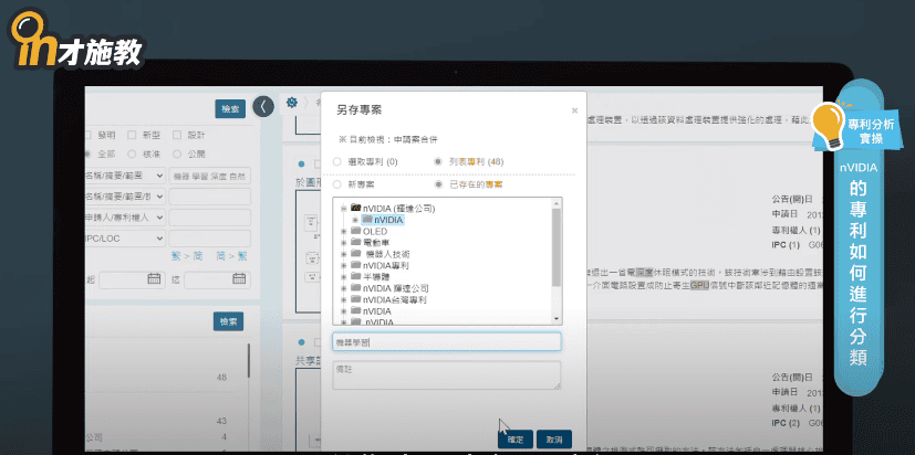那如果沒有太多疑慮,就可以將這些專利另存在nVIDIA技術枝節下方,命名為「計算」。接下來,將「機器學習:包括深度學習、自然語言處理和電腦視覺」的相關關鍵字整理一下。因為都已經在nVIDIA專案內操弄資料,所以會將關鍵字放大檢索。