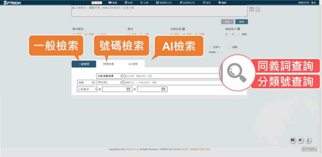 想運用同義詞檢全專利,只要打開萬能放大鏡,填入字詞,聰明的IPTECH即可顯現出相關同義詞;分類號也有這種功能喔,讓您可以快速使用各欄位整合性檢索~操作讓您更流暢!