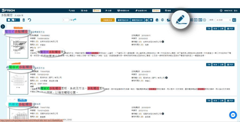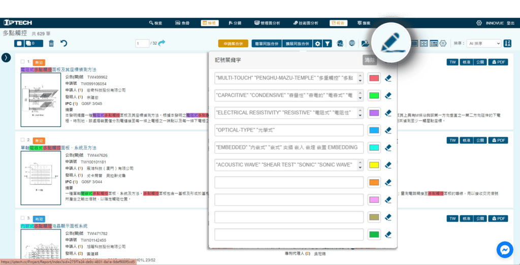 點選系統的「小畫筆」,也就是記號關鍵字功能,並輸入想找尋的關鍵字,紅綠紫藍,五彩繽紛的色系,讓您開心用Highlight,也讓閱讀專利更清楚、更繽紛,不只如此,HIGHLIGHT還可以無上限新增喔,甚至還可以自行調色