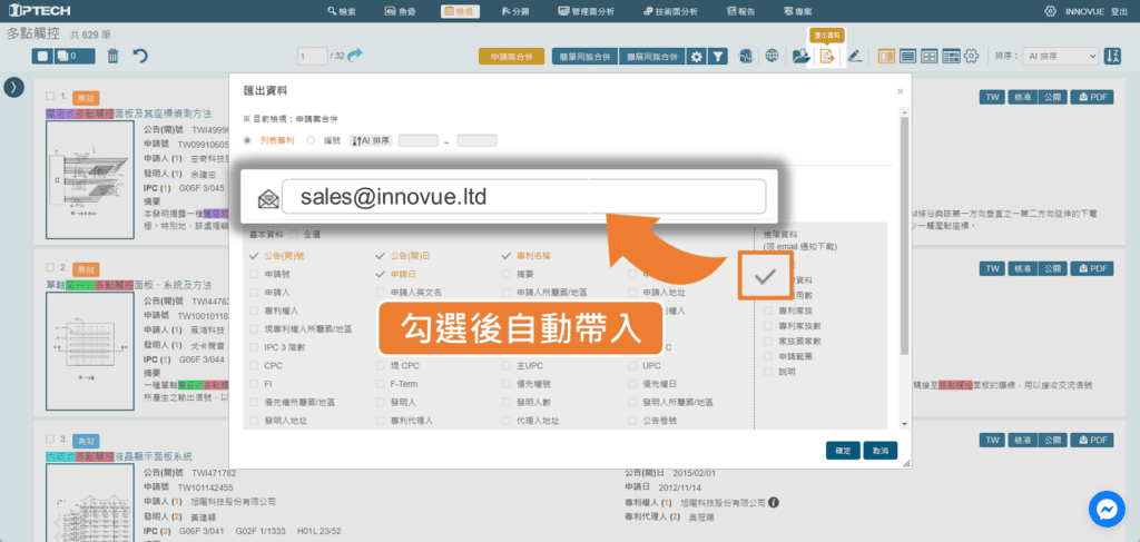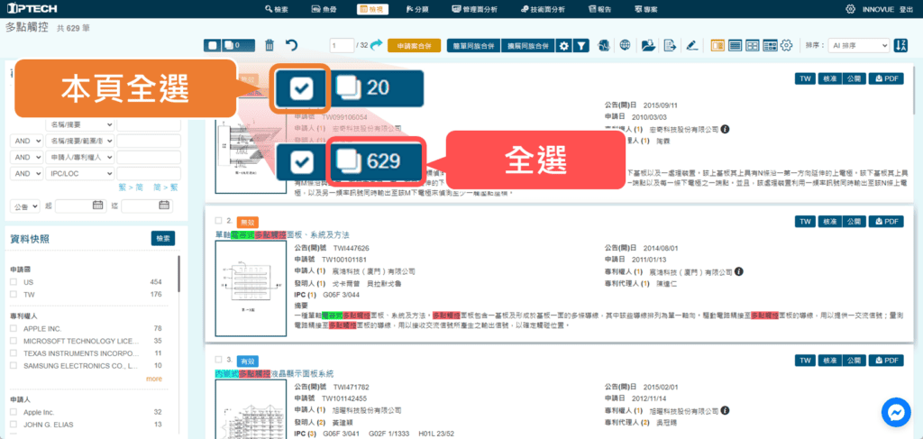 選取專利,事半功倍,勾選專利勾到手麻了嗎?IPTECH滿足你的每一個需求!在檢視頁或分類頁,都可以看到左上角的ICON,按下左邊的就可以選擇單頁20篇的專利、或是右邊的就可以全選專案內的專利喔,『本頁全選專利』或『一次全選所有專利』,兩種功能讓你隨心所欲運用在各種情境,不論是刪除、匯出專利、分類拖曳,這麼多種情境,都可以抗的住!
